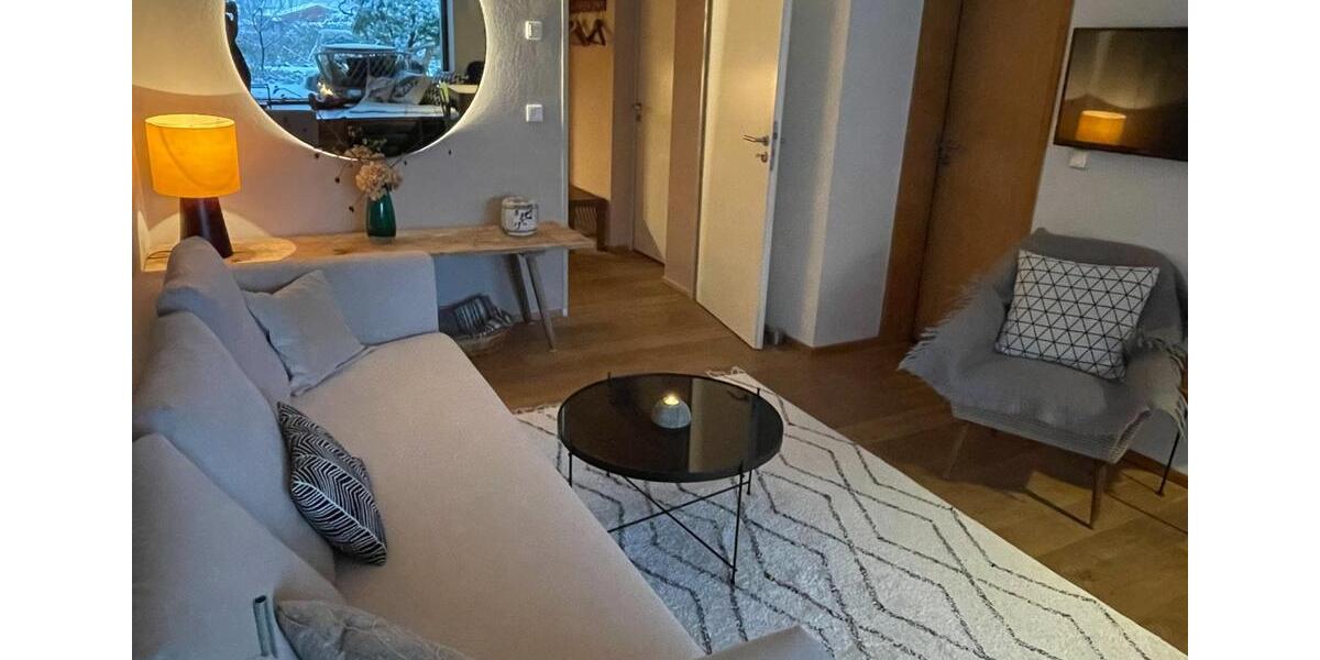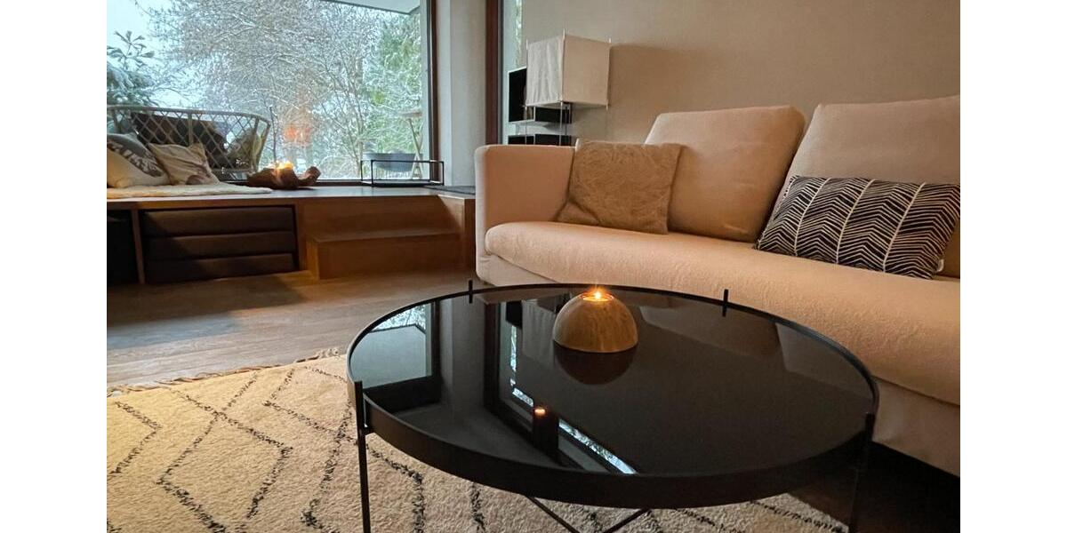 Schöne ruhige Ferienwohnung direkt am Wald im Gartengeschoss meines Hauses. Durch das große Panoramafenster schaut man auf die sonnige Terrasse und den Garten. Saunanutzung mit Kuschelnest auf der Dachterrasse gegen Aufpreis.